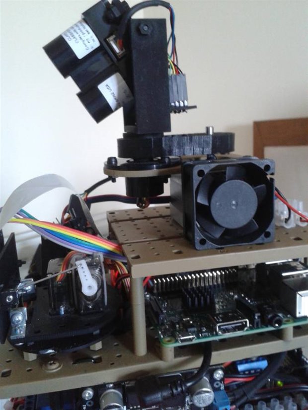 I've recently added a 3d LIDAR scanner to my robot ( Credit to these guys on youtube here they've done a fantastic job https://www.youtube.com/watch?v=gCpCGkwwy8I )   and now that ive started working with Stepper motors a lot more closely ive soon discovered that these things run HOT!  So ive been working on implementing some forced induction cooling image   Taking power from the starboard mounted DROK digital buck converter ive cabled a 12v fan in via the 4x solid state relay mounted on the front deck. this is controlled by the aft mounted arduino UNO that's dedicated for the "Science Platform" on the top deck. I have a 30x30 heat sink on coming tomorrow that i hope i can mount between the fan an the stepper to offload some heat....