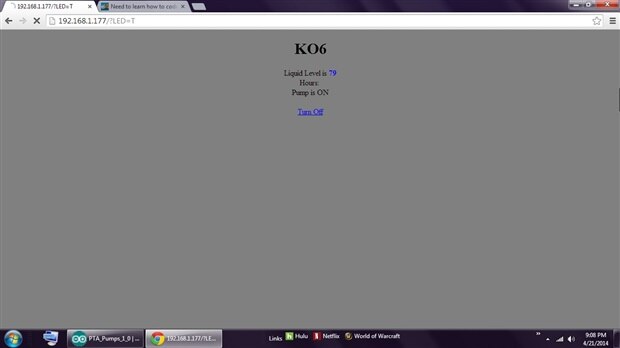 I am new to Arduino and I am having a hard time figuring out how to create a hour meter. I am using an uno with an Ethernet/SD shield. I have that hooked up to sump pump and a transducer. I am able to see the liquid level and control the pump via web page. However, I would like to create a hour meter that records the pump run-time hours, and prints it on to the web page. Here is my code,