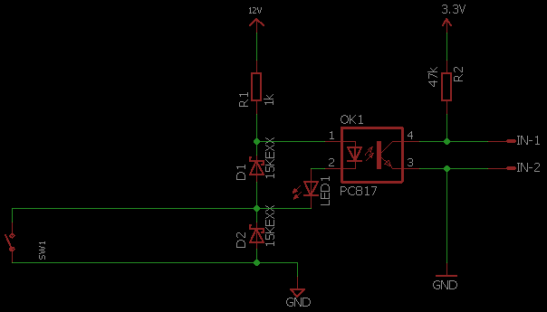 1. A switch on a long wire. So let's say you have Due on one side of the room and a switch quite a few meters away. You mention that you usually just use a shielded 24+awg wire. Is that directly connected to Due pin with internal pullup on? I am guessing that normally the line is pulled down to GND (normally closed circuit) and when switch is pressed, circuit opens and the line is pulled up to 3.3V. Is that how you connect it? A long wire can cause significant voltage drop so could not it happen that if the circuit is closed the voltage on input will not drop below the threshold (2V) due to voltage drop on that long wire and the pin will stay high? Also are you not afraid that a voltage spike (I guess it can happen even though the cable is shielded) will damage Due's input pin?I guess I would at least go with something like this at a minimum if connecting directly. But considering optocouplers are much more safe I'll probably go with them for inputs and outputs.