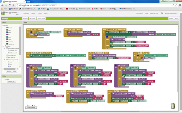The arduino code responds based off of the text that is sent from the app. Here is the block code i have so far for the basic funtions of the app. All i need to do now is be able to recieve some sort of…