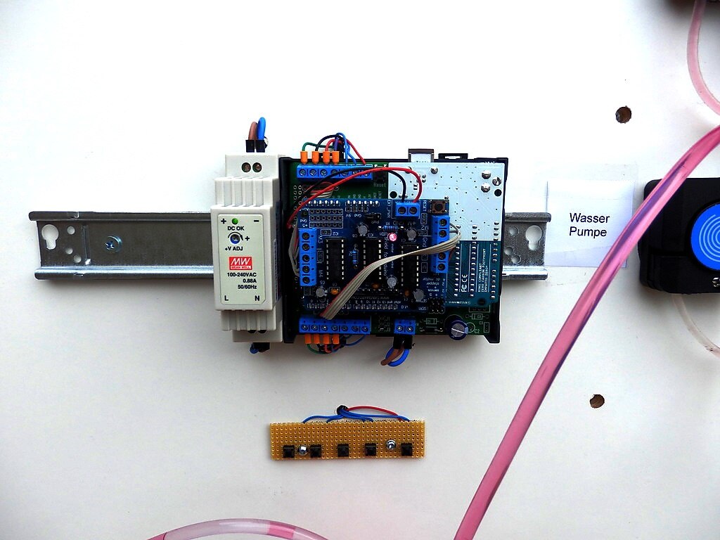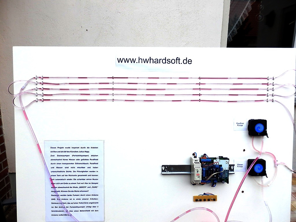 I want to introduce this  demo project for the Maker Faire in Hannover last weekend. The project was inspired by the work of the artist Julius Popp. We are using a transparent hose, 2 peristaltic pumps and an Arduino Uno with motor shield (both mounted in an Arduino Din rail enclosure ) to build a simple display.