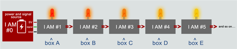the other boxes (let's call them slave boxes) get their power from the master box and also has an led, the closer the slave boxes are to the master box, the brighter the led.