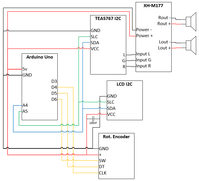 You can see that everything is read from left to right (inputs like the rotary encoder are on left side, audio output on right side), and no need to use the half-circles to show where there are no connections, you can use a solid circle to define connections. The supply rails can be labelled as such, and shown at top and bottom, with the +5V at top, and 0V at bottom.