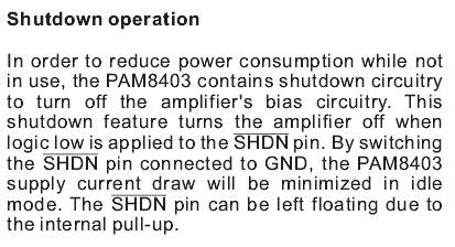 Thanks for finding that but it seems that the SHDN pin is omitted on the module I have (XH-M177 diagram) and I'm not planning on soldering right on the IC, my soldering skills are not on par. Also seen on the diagram: a bunch of capacitors (C1 through C5?) of which C1 is a 470 UT (= 470uF) 6.3V. Thank god for those modules or it'd be weeping in a corner by now...