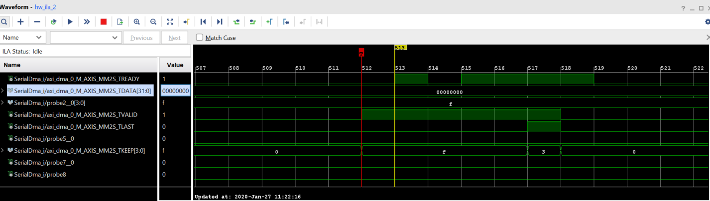 I connected the ILA to see the data at the m_axis_mm2s from axi_dma and it shows the m_axis_mm2s_tdata[31:0] always zero besides m_axis_mm2s_tready, m_axis_mm2s_tvalid and m_axis_mm2s_tlast seems ok.
