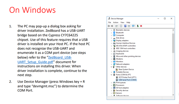 I am following the instructions in the slideshow attached. My problem occurs during "Verification of Communication with ZedBoard" (then "On Windows" because I am using Windows 10). I follows steps 1-7, then when I connect the board to the computer through the USB-UART cable, nothing happens. I have tried installing the driver (https://www.cypress.com/documentation/software-and-drivers/microsoft-certified-usb-uart-driver), but it does not show up in Device Manager (there is no "Ports" tab under Device Manager). When I use "Add Legacy Hardware" to add ComPort3, the port shows an error ("Code 31: This device is not working properly because Windows cannot load the drivers required for this device "). Also, when I try to adjust the settings of the port, the menu looks different to me the instructions and I am not sure which settings to change. This is where I am stuck on the driver installation process.