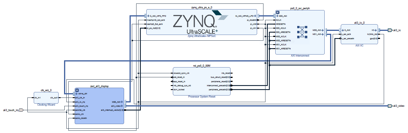I bought from Avnet a Touch Display 10' (AES-ALI3-AMPIRE10-G) and an UltraZed 3EG Kit (AES-ZU3EG-1-SK-G). Unfortunately, there isn't any reference design on what I have seen on the web. The closest reference design was found on GitHub Avnet HDL Reference Designs (https://github.com/Avnet/hdl/tree/master/Projects/zedboard_ali3_amp10). Unfortunately, this project is targeted for a Zedboard, therefore changes must be made.