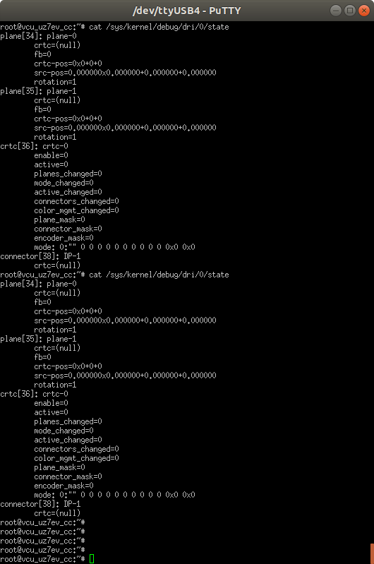 (3) I was able to get colorbar show up on the monitor at 1920x1080 on ZCU106, but the two Ultrazed boards showed different behavior, one has no resolution (return nothing) when poked with "$ cat /sys/class/drm/card0-DP-1/modes", the other board returns "1366x768" and others, but no 1920x1080. I was able to get colorbar on Ultrazed with resolution of 1366x768 with "modetest ...". This might be an EDID issue?