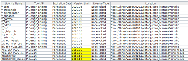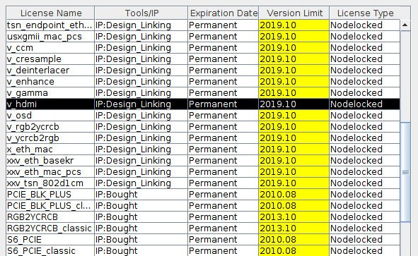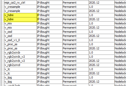 I learn something useful everyday image.   There are so many license variants that it's hard to keep track.  I see for the PL DisplayPort that there is a dp and v_dp license.  I am using the PS GTR implementation of the DisplayPort so haven't run into any issues there although I do see that as you mentioned that I don't have either the dp or v_dp license.  I do have the v_hdmi license but it's listed as "DesignLinking" so I'll try that hdmirx design in Vivado to make sure I don't have any issues.  It's possible I may not be able to write the bitstream if this is a simulation only license.   I notice that your license is listed as "bought".   I have to admit I don't pay much attention to licenses unless something doesn't work.