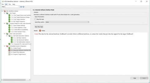 Moreover, the step 4.2 (Generate software interface model) of hdl coder fails with next message: "Failed The data for the selected hardware 'ZedBoard' is invalid. Select a different hardware, or contact the vendor that provides the support for the target 'ZedBoard'."
