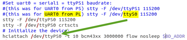 Looking at your block diagram, you are using a PL-based, AXI-uart16550 for your Bluetooth UART interface. However, assuming these old comments are accurate, you are pointing things to the PS-based UART0…