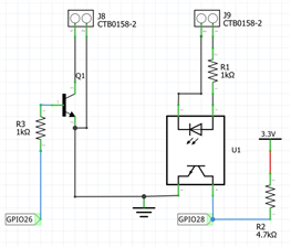 - Optocupler, two 1kOhm and one 4.7kOhm resistors;