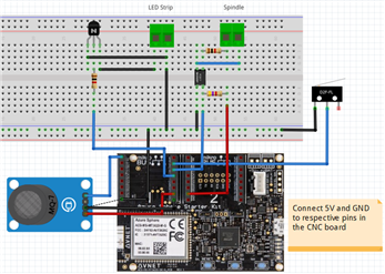 The usage is basilar and easy. When you open the door, the limit switch is triggered and Azure Sphere will turn ON the LED strip. Spindle status (ON/OFF) will be monitored for each cycle of the loop, incrementing cycles value locally and sending the value to Azure Cloud when available. The value is resettable by pressing B button on the board.