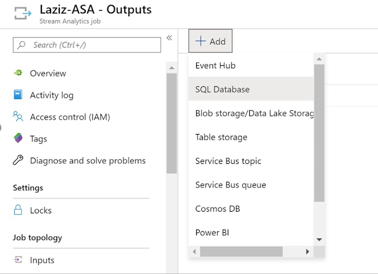 4. Alternatively, you can setup Azure storage account or a database as an output for Azure Stream Analytics job.