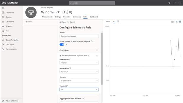 Under Rules add telemetry rule as described below, which will trigger the rule when rotation sped goes beyond 25 rotation per minute for a period of 5 minutes, then save and click on the action, select the email and provide the email address as described below.