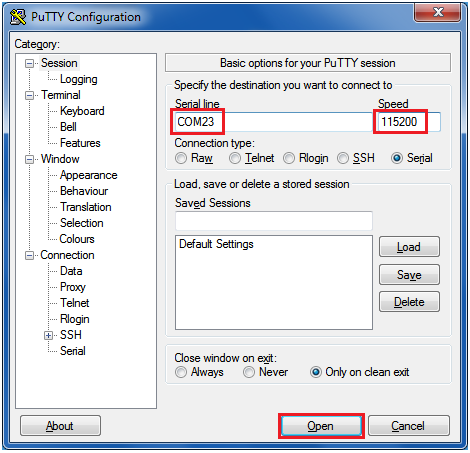 After opening putty terminal press the reset button then you can see the below execution window: