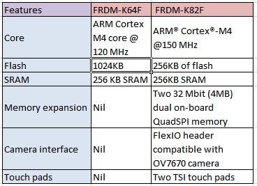 Find below the comparision sheet for K64F and K82F freedom board: