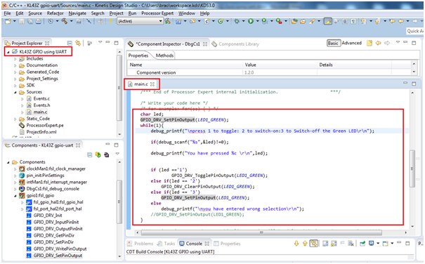Here is a Project created using new KDS version 3.0 and Kinetis software development kit 1.2 on processor expert platform. This project controls the GPIO (LED toggle/set/clear) using command over UART console communication using debug_console and fsl_gpio component implemented using KL43Z freedom board.