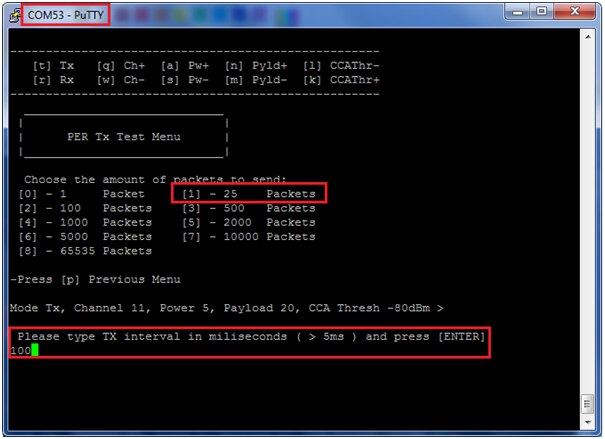Press ‘1’ here in transmit terminal to send 25 packets it will ask TX interval in milliseconds i have given 100ms. Now press enter to send packets