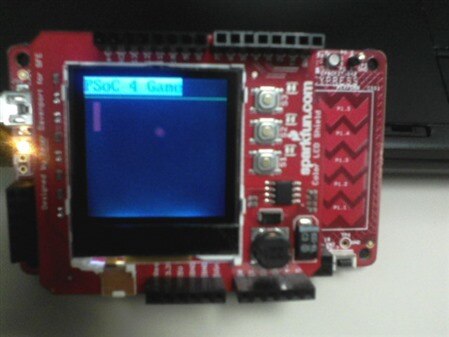 This example project uses the custom GLCD component and the button inputs on the Sparkfun GLCD shield board to generate a simple paddle and ball game. The game is simple, the user must not allow the ball past the paddle. The S1 and S3 buttons on the Sparkfun LCD shield are used to control the onscreen paddle. The user can either move the paddle up or down. If the user misses the ball the screen will go black and the user will need to hit the reset button on the Pioneer kit to play again.