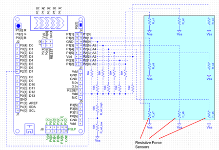 Force measurement can be very simple or very difficult depending on the constraints of your system. Were this an example for a cell phone, the sensors would need to be very small, screen printable, and cheap. Suitable technology for low cost sensors exists, but we chose to use a similar but more convenient force sensor.