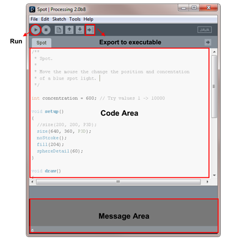 In this example we will use the programming environment called Processing. This open source coding environment allows the user to generate simple computer based applications. Users can create applciations that generating interfaces, displays, and outputs. The following image is the Processing development window. You will notice, if you have experience with Arduino, that it looks very similar to the Sketching environment for Arduino.
