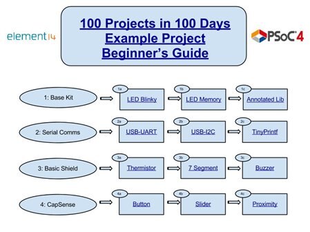 We’ve been going strong putting out great projects over the last few months. Today and over the course of the next week we want to step back and help out any of the new people here on the 100 projects in 100 days. Today’s post is not a project but a roadmap for those new users. We’ve put together a mind map of example project using a subset of the projects that have been released on the 100 projects series. This mind map has a short set of topics we feel new users might want to start with. Each topic then has three example projects linked in order of complexity. Each referenced example projects has a hyperlink back to the element14 post for that project. We feel these projects are a great start for new PSoC or Pioneer kit users. Attached below is an image of that mind map. Attached to this post is a PDF document that has clickable links to those projects. Feel free to download the document and pass it to anyone who might be interested or who you know just purchased a new Pioneer kit.