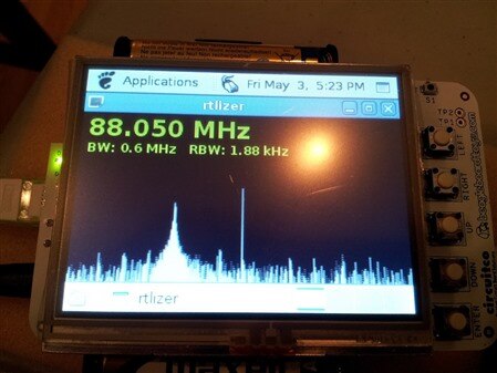I'm hoping to get RTLizer (an RF spectrum analyzer powered by a USB DVB receiver) to run on the BeagleBone BlackBeagleBone Black using the HDMI output and GPIO inputs for controls. Here's what it looks like running on my original Boneoriginal Bone with a LCD3 capeLCD3 cape and battery capebattery cape: