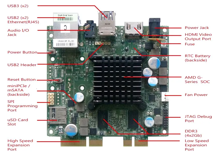 Physical PCIe 36-pin and x4 edge connectors standout between the boards presented above. These edge connectors provide direct access to the embedded peripherals of the board, i.e. GPIO, ADC/DAC, PWM, SPI, (more) USB, I2C, display port, PCIe, and SATA. By designing a daughter board, the Gizmo's functionality can be extended to meet other application requirements. Some of the examples that I can think of is by the creation of a daughter board with SATA connector, the Gizmo board can be used to build a NAS server. Another would be to directly interface with sensors and read sensor values via ADC, or connect to other RF modules such as ZigBee through the SPI lines, etc. With this capability, it actually makes it possible to create a product application utilising low-level peripherals without the need for an extra MCU.