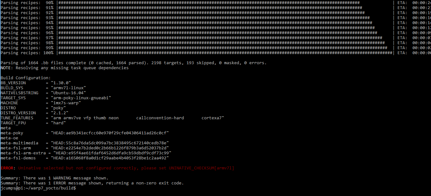 It goes a significant step further now, then ends with bitcace throwing a different error Uninative selected but not configured correctly, please set UNINATIVE_CHECKSUM[armv7l]