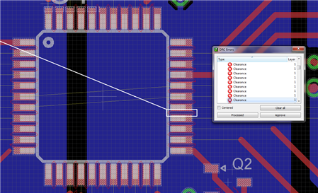 I've recently run into a problem with Eagle that I've never had before. I've done quite a few layouts with a 44-pin TQFP package, but with my last design the DRC gives me errors on the spacing between the package's pins. I'm using the same .dru file as I have previously, and it still works with my other designs, just not this one. I've attached an image showing the spacing errors. Any thoughts?