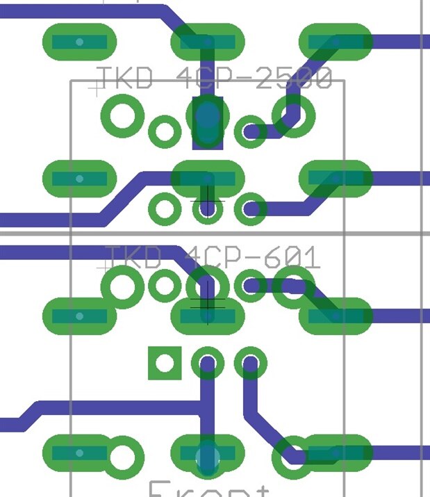 I am laying out a 2-sided board, and wanted to put 2 different connector footprints/pads/holes to allow the user to select which connector type to use. These are 3-pin Molex KK 0.100" and Phoenix 0.508" connectors. The center pin of each is connected to a top ground plane. In the past on commercial PCBs, I have manually added the Molex connectors in exactly this way, and they fit fine. There is also ample clearance between the pads for pins 1 and 3 of both connectors (no DRC errors).