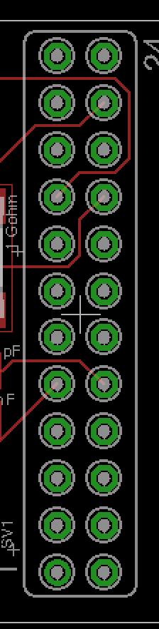 I'd like to have the pins of the connectors soldered to through holes where they connect to the traces on the top layer (ideally the only layer) of the board. The plastic of the 12x2 connector should be positioned below the top layer with the pins facing upwards, and the plastic piece of the 3 pin connector should be above the top layer of the board. I've attached a couple pictures of how I have it currently designed in my Eagle board layout.
