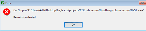 Hi, I was trying to design a pcb following my schematic design but every time I am trying to save it, the following dialogue box pops up and says permission is denied. How can I resolve this problem? My OS is windows 10 and I am using eagle 4.12 professional.