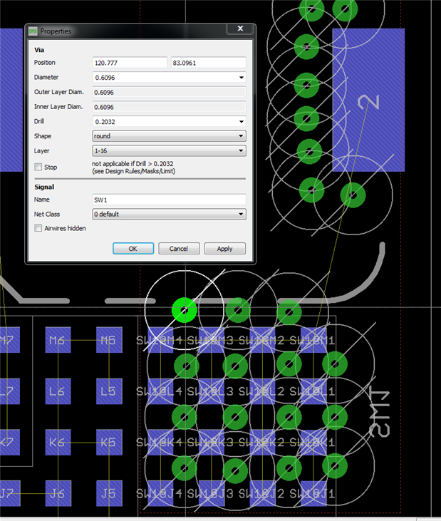 here is a better picture / explanation: Wire "SW1" is Connected to PIN #2 of a device and multiple pins of power regulator, as shown (inverted view due to components on the other side of the PCB). I needed the VIAS to be the same net name as that wire.