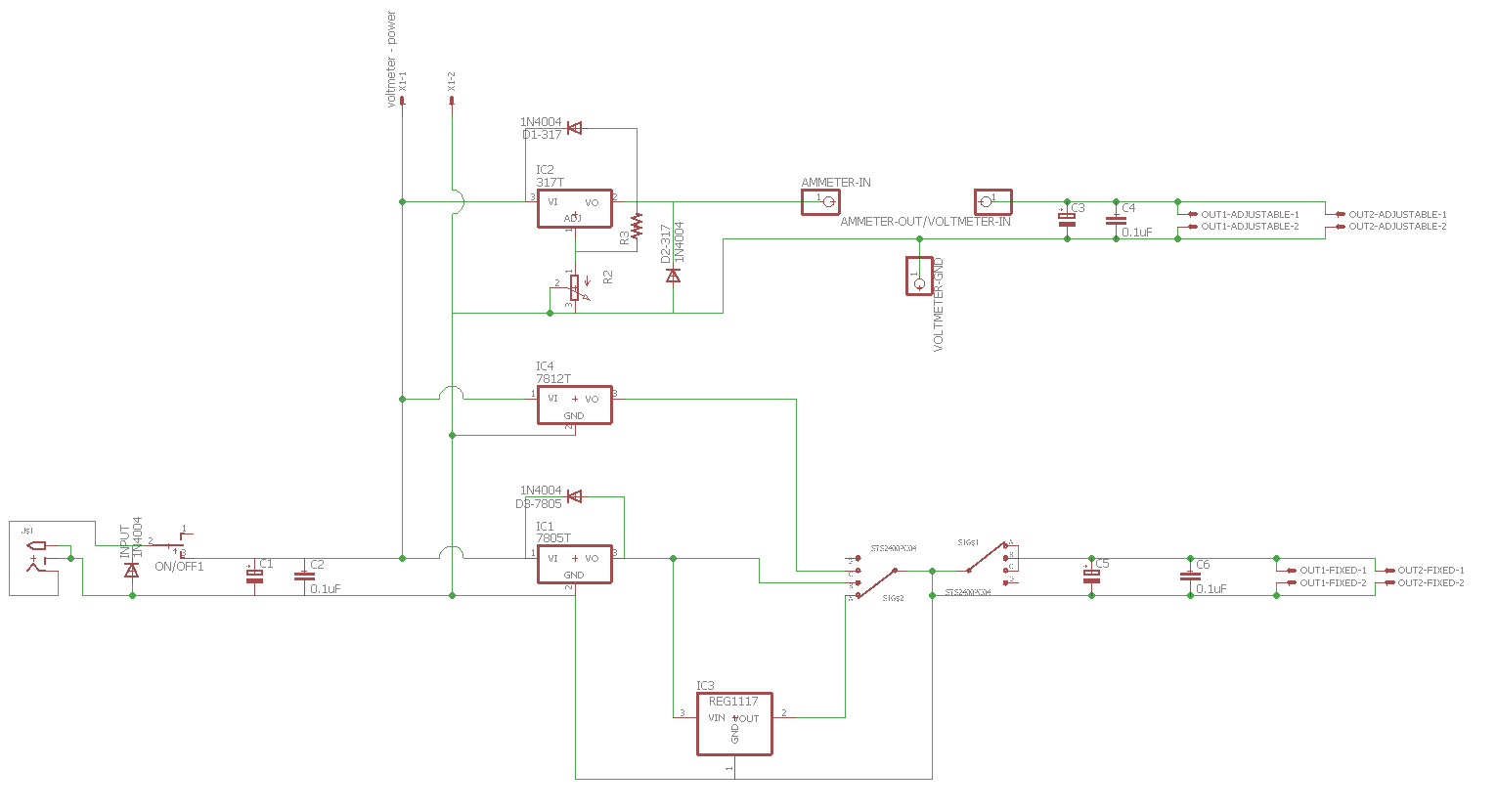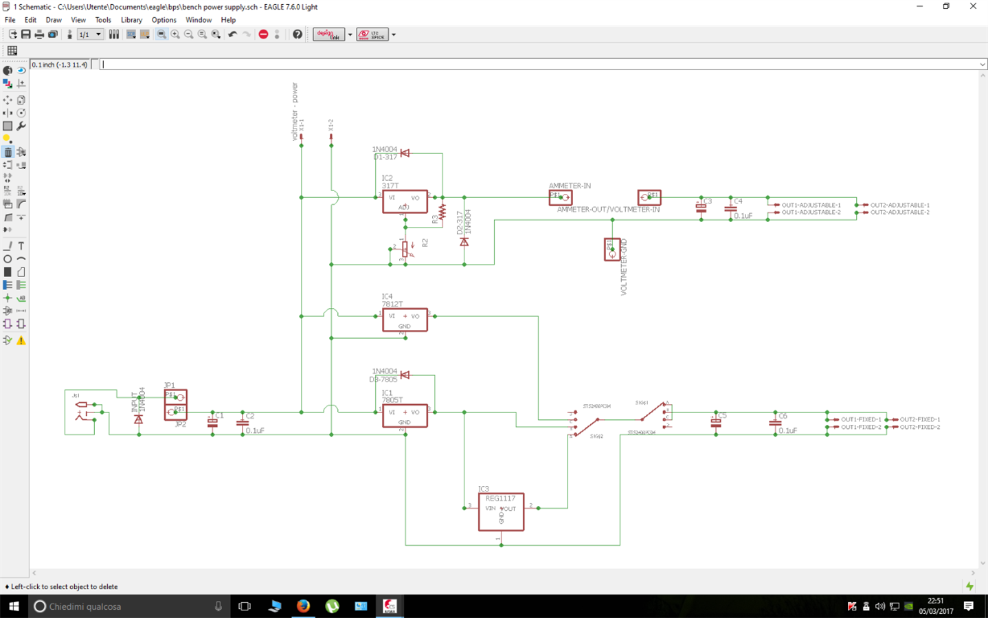 I started drawing in eagle this afternoon to make my first home made pbc board for a bench power supply that with an input of 12V/5A will have two output of 12V, 5V, 3.3V and an adjustable voltage (lm317)