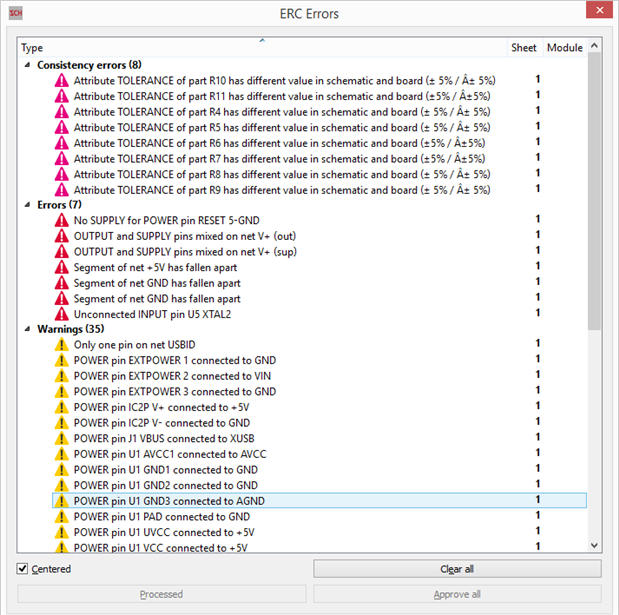 I have modified an Arduino Leonardo board and added some resistors. The problem I seem to have, which didn't come up until after I closed my project (never having the schematic and board opened separately)and reopened it, is consistency of many resistor tolerances. This is what the ERC report says: