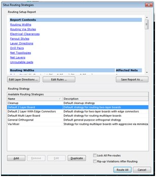 It’s time to auto-route. You can also do this manually defining all the track angles, clearances etc, but for the purpose and scope of this blog, to keep it quick, I’ll use the auto-router. Go to the “Tools” menu and click on “Autoroute” and then select “All..”. The “Situs Routing Strategies” window should show up as below. Click “Route All” at the bottom of this window. The routing should start and within a few minutes completed with a message box showing the status. This is shown in the screenshot below.