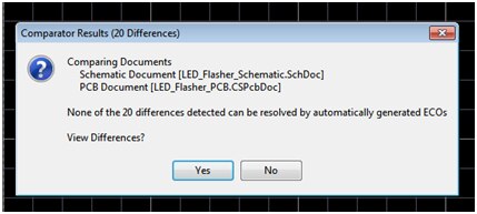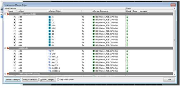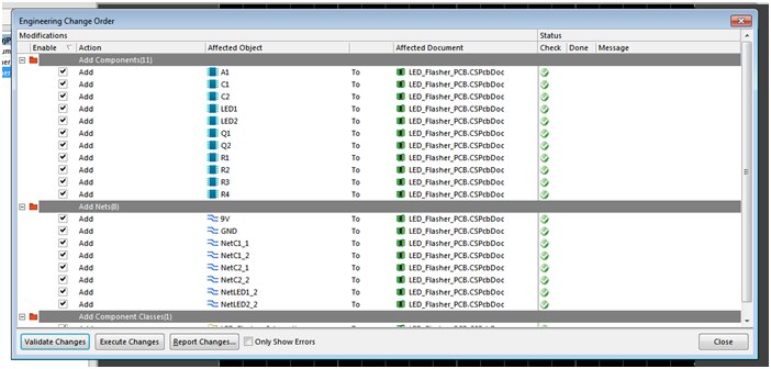 Now, it’s time to import the schematics into the PCB. Navigate to Project → Update Schematics in LED_Flasher, this brings up a dialog box showing the recent changes (if any). If there are any last minute changes in the schematic, you can cross check them here before starting to create the PCB. Once you are happy with the changes, click on “Close” to close the window showing you the changes.
