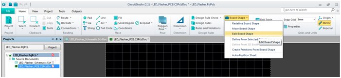 The next thing to do is to set the Grid size and units on the far right of the ribbon. The default uses Imperial system of measurement, I’m going to use the Metric and set snap grid size to 5mm. Also note, it helps to set the Origin to the (0, 0) if that is not the default origin already. This might be a little tricky to move the mouse to the exact position, but should come with a little practice. Once you set the Origin, click on “Absolute Origin” to move the origin of the board.