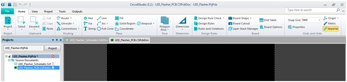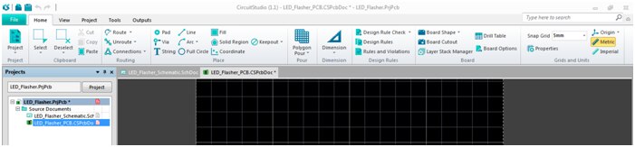 Open up the project (well, if it’s not open already..) and click on “Project” → “Add new PCB”. This generates a blank PCB document with a default file name. Go ahead and give it a name. I like to keep it coherent with my schematic file name, so I’m going to name this “LED_Flasher_PCB”.
