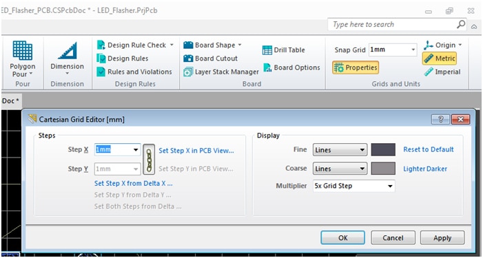 You can also change the grid size at this point depending on the placement you need. This is done from the Properties button under the Grids and Units group. I’ve set mine to step 1mm in X and a multiplier of 5x Grid as shown below. Click on “Apply” then “OK”.