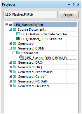 Notice in the “Projects” window there are now a lot of different documents specific to the project such as BOM, DRC, STEP, Drill/Pick Place etc for you to take them to the printer. Have a peek into each of these files (if you have the right viewers). The BOM is shown as an excel workbook for you to print/save etc as shown below.