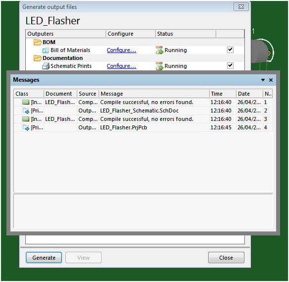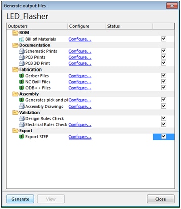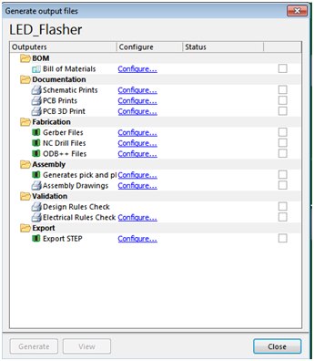When you are happy, it’s time to generate the output files for the PCB manufacture. Navigate to the “Project” tab and click on “Generate Outputs”. You should see a window with all the output files that will be generated for the project like this below: