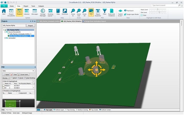 With the mouse pointer on any component, hold the “Shift” key on the keyboard. You will see a 3D sphere on the component as below. With the shift key pressed, hold the right click and drag around the board to view it in 3D.