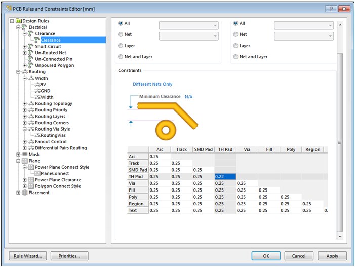 With your PCB document selected, navigate to Home → Design Rules. Select the “Clearance” rule under “Electrial” section. Reduce the TH Pad to have a min clearance of 0.22mm as shown below and then click on “Apply” →”OK”.