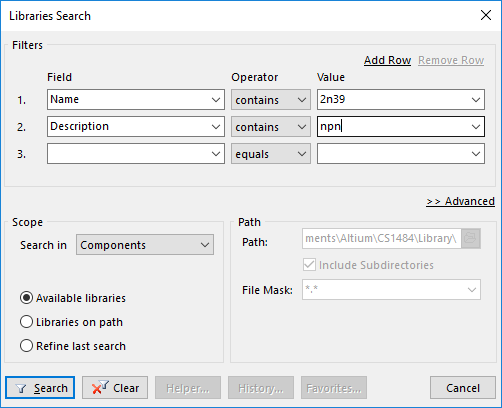 My understanding was that if I used the 'Search...' button, the Libraries Search dialog would appear, and when set searches all installed libraries and returns the results as 'Query Results'. If I just select the 'Miscellaneous Devices.IntLib' with an asterisk ('*') as my filter string I should get everything in that library listed in the Components List. I get nothing. (I've read the Documentation on the Libraries Panel here. I just don't get this functionality.)