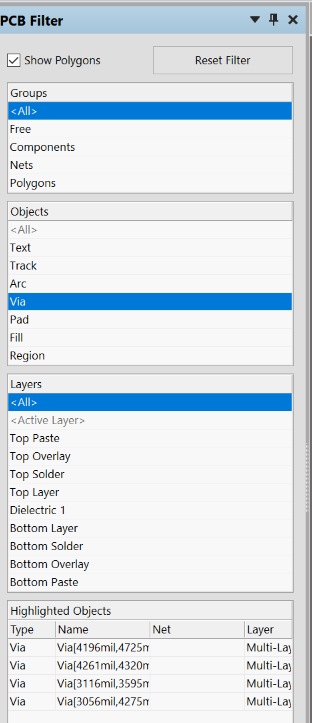 If you have different size vias it may be difficult to sort them this way.  In AD you can use advance filters to get specific ones by size.