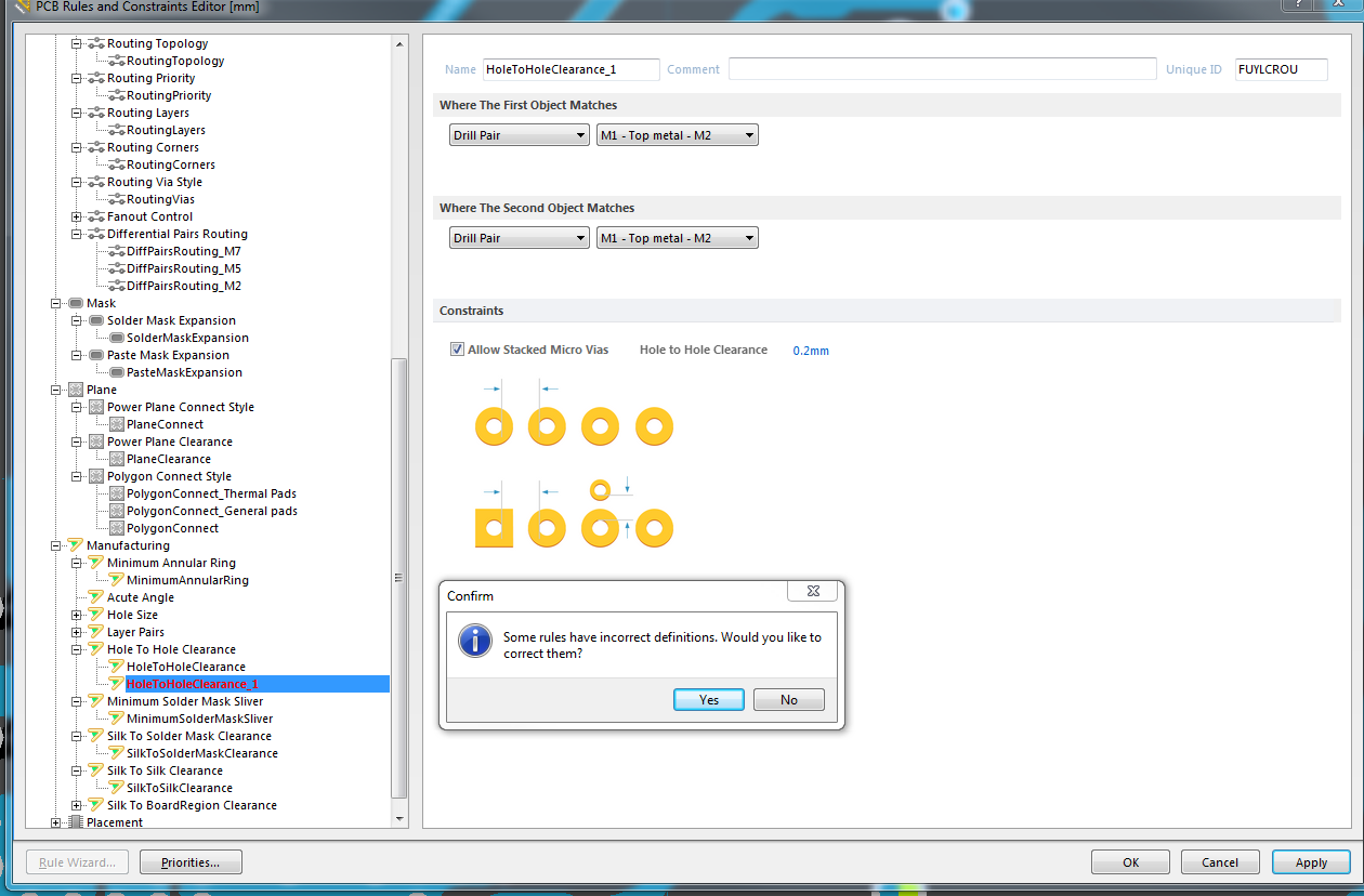 I have been trying to set a different 'hole to hole clearance' for drill holes on specific drill pair. All holes have 0.25mm clearance and for drills on M1-M2 I would like ho have 0.2mm clearance.