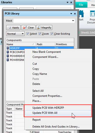 The PcbDoc and library editor are open, but when I right click the 0603 footprint in the library, I get the drop down box with just 4 elements, "Refresh Library, Place, Select Columns, and Edit Footprint". I no longer get the option to "Update PCB" as shown in your pic above.